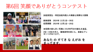 SAVE事務局 第6回 笑顔でありがとうコンテスト始まります 今年も、えがおでありがとうコンテスト が始まります。★コンテストはこちらから・・☆正式なご案内 ・ 在留中の技能実習生・特定技能外国人の、笑顔の画像をエントリーしてください。(職員の代理投稿可)・ イチバンたくさんの「いいね(★マーク)」が... 2024.10.22 SAVE事務局