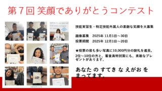 今年も、えがおでありがとうコンテスト が始まります。★コンテストはこちらから・・☆正式なご案内 ・ 在留中の技能実習生・特定技能外国人の、笑顔の画像をエントリーしてください。(職員の代理投稿可)・ イチバンたくさんの「いいね(★マーク)」が...